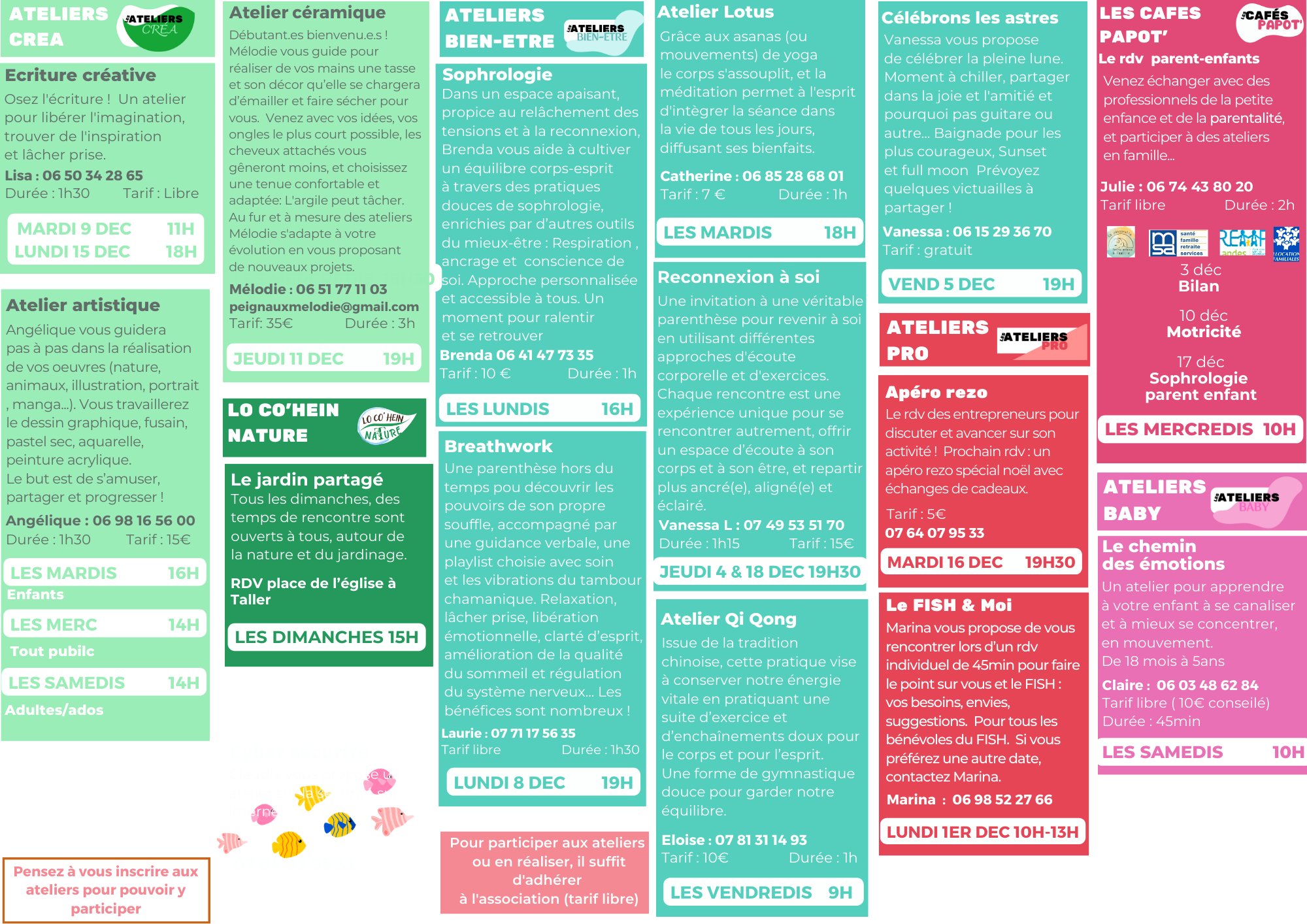 A travers un collectif qui s’agrandit au fil de ses rencontres et de ses partenariats, nos membres actifs proposent des ateliers créatifs, numériques en lien avec le bien-être et le développement personnel… Ces ateliers sont proposés en parallèle du coworking (à des horaires distincts ou dans des espaces dédiés) Laissez-vous surprendre par un programme haut en couleurs…